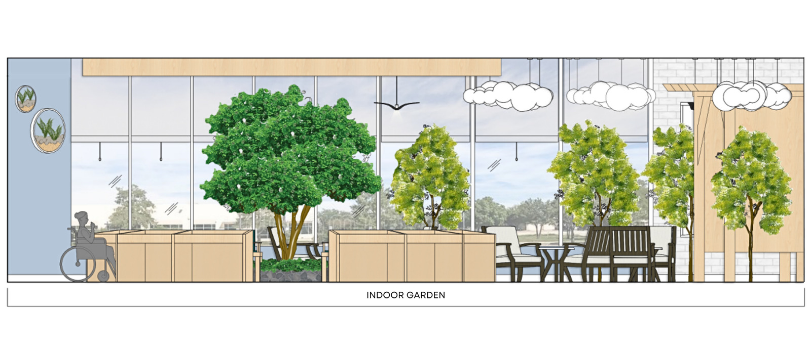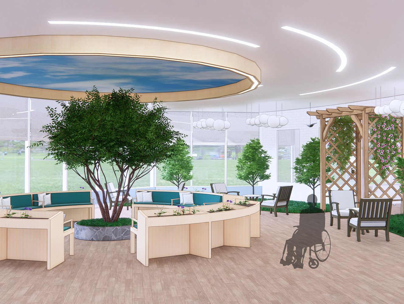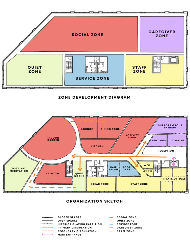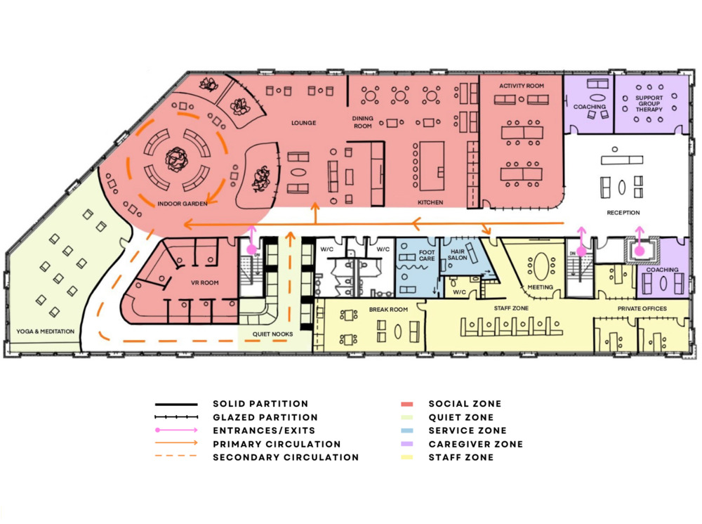 Sage is a dementia awareness and day program facility designed to educate dementia patients and their families about the condition, as well as offer treatment through adult day program activities. Through a home-like atmosphere with versatile spaces and an indoor garden, the facility aims to reduce the stigma around the medical condition by creating an inclusive community that will support one’s social, cognitive, and physical health and well-being to enhance their quality of life.