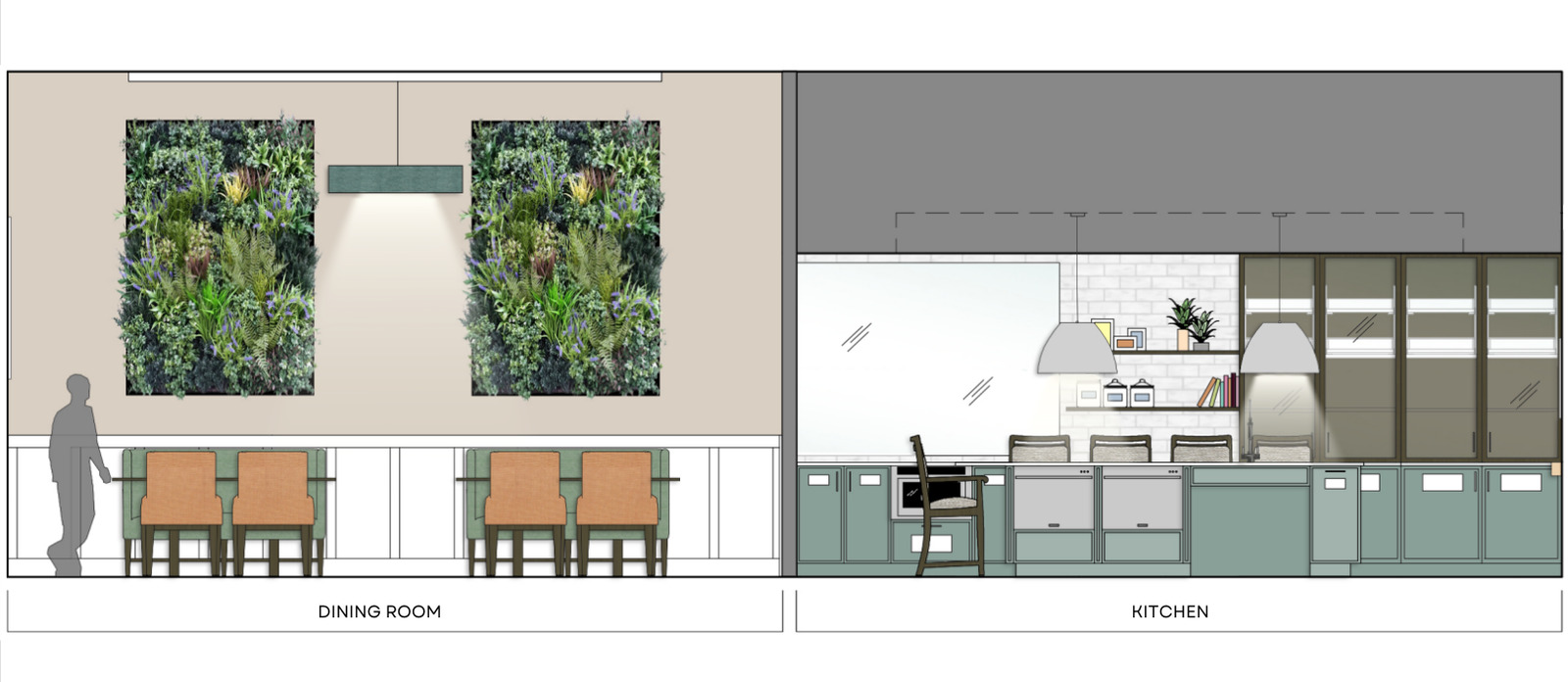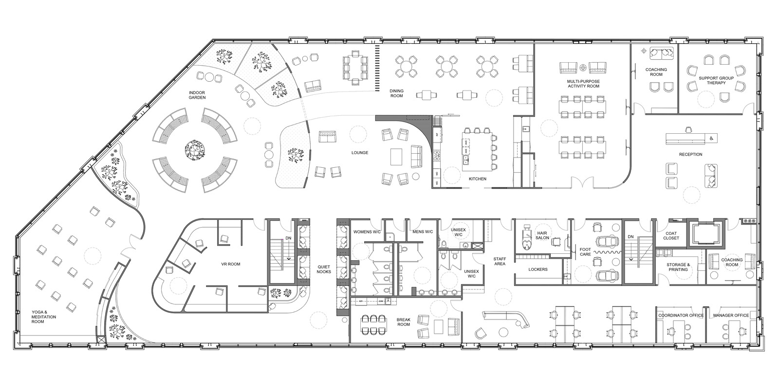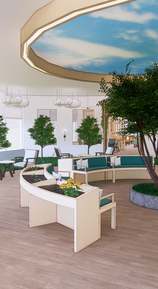 Sage is a dementia awareness and day program facility designed to educate dementia patients and their families about the condition, as well as offer treatment through adult day program activities. Through a home-like atmosphere with versatile spaces and an indoor garden, the facility aims to reduce the stigma around the medical condition by creating an inclusive community that will support one’s social, cognitive, and physical health and well-being to enhance their quality of life.