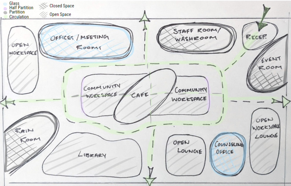 This thesis project is based on discovering how to adapt to a physical environment to reduce sensory overload in adults. The project will also touch on what physical aspects cause sensory overload to find out how a space can affect a person's senses. This will provide answers to designers and accommodate individuals with sensory issues through the built environment. The goal is to create a non-intimidating workshare space, with different amenities that support all types of sensory-sensitive individuals. The main attraction of Your Workshare Studio is the rain room, a restorative feature that provides an immersive sensory experience to help occupants focus and relax.